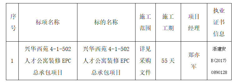 衢州市城投工程咨詢有限公司關于興華西苑4-1-502人才公寓裝修EPC總承包項目的成交結(jié)果公告(非政府采購項目)