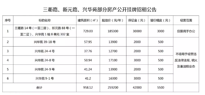2.以上標(biāo)的租賃期限均為5年,上述標(biāo)的首年租金按成交價(jià),從第二年起在上年租金基礎(chǔ)上遞增3%。
