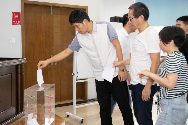 隨后,以無記名投票方式,選舉產(chǎn)生了第一屆工會(huì)委員會(huì)委員,王堅(jiān)威當(dāng)選工會(huì)主席。