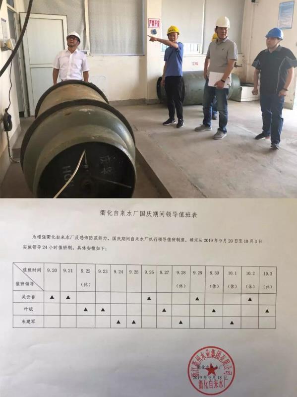 19日,檢查組繼續(xù)開展綜合檢查。在衢化自來水廠,重點對消防設施設備、消防臺賬、安防措施進行了檢查,實地查看了中控室、加氯間、反應沉淀池,詳細了解了國慶期間值班安排等情況。