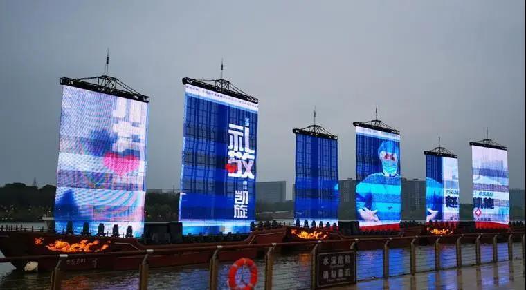 在水亭門歷史文化街區(qū)的公屏上,滾動(dòng)播放著衢州馳援湖北的白衣戰(zhàn)士的抗疫視頻和海報(bào)。