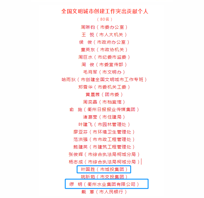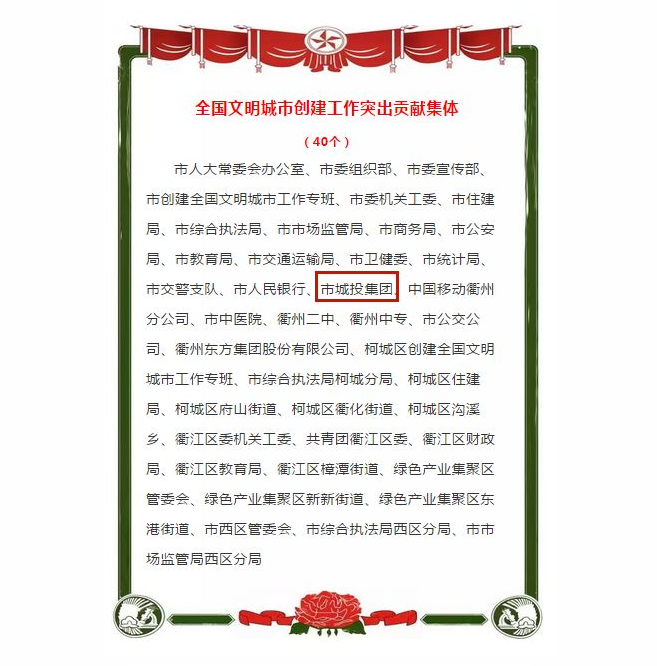 其中,市城投集團獲全國文明城市創(chuàng)建工作突出貢獻集體,葉國勝、繆明獲全國文明城市創(chuàng)建工作突出貢獻個人。